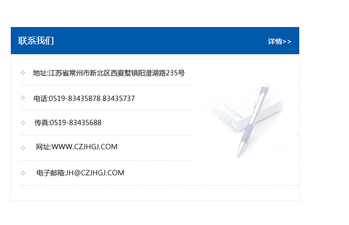 地址:常州市新北區友邦商務大廈1幢16、17層  電話:0519-85101652  傳真:0519-85112595  郵編:213022  網址:www_cz-jiayue_cn.xiangzhang18.com  郵箱:xiajifengaa@163.com